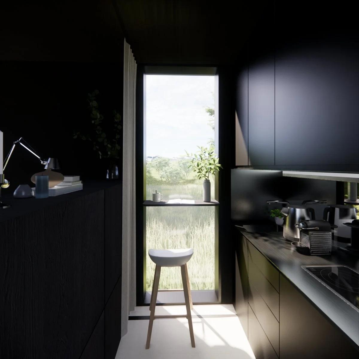 Diseñar un pequeño espacio para usar como cabina de hotel, pero con el plus de estar sobre ruedas para poder ubicarla en medio de la naturaleza.